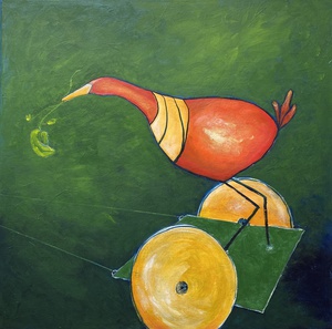 2015Een vogel op een wagen voortgetrokken door....Wie trekt de kar ? Beschikbaar